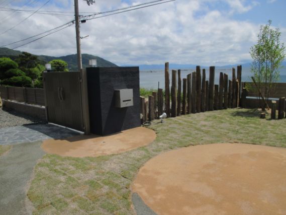 こちらのお宅は、広々とした駐車場やお庭、ウッドデッキなど開放感のあるエクステリアです。開放感がありつつも、玄関アプローチに階段を設けて道路とは高低差をつけていますので、プライベートな空間も確保したつくりになっています。そのため、高い塀などを設けなくても死角を作ることができるので、住宅側からは開放的な空間が広がります。お庭からは、海に対して遮る物を極力減らすことで、とても見晴らしの良い空間が広がっています。 駐車場スペースは、広々と空間を設けています。コンクリートで仕上げており、耐久性も確保でき実用性の高いです。駐車場の横には、玄関アプローチの階段があり、そこを登るとアイアン製の門扉とグレーの門柱があります。門扉と門柱はシンプルでシックなデザインのものを採用しており、建物の重厚感と相まって綺麗な空間になっています。門扉を通り抜けるとアプローチとお庭が広がります。お庭には、飛び石を設置したり小石を敷き詰めたりして、和を感じさせる空間を作っていますし、住宅側には大きなデッキを設置しています。デッキからは、海を見渡すことができますので、ここで休憩すると見晴らしが良くとても気持ちが良さそうです。