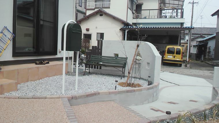 こちらのお宅は、白い外壁の建物の色合いや雰囲気に合わせたエクステリア設計し組み合わせた住宅です。門柱は、カーブを付けた壁に正方形の穴を空け、壁の形も高さを変えたりしています。この門柱の対面にも、同様のテイストの壁を設置しており、その間が玄関アプローチになります。壁に正方形の穴を空けていると、見る角度によって壁から見える物が変わり、白い穴だったり黒い穴だったり黄色い穴だったりと色が変わってポップな印象も受けます。 玄関アプローチは、コンクリート仕上げの道にレンガを部分的に配置してデザイン性を高めています。アプローチ階段も設置しており、ここから玄関ドアまではフロアビーズを使った橙色の地面になっています。アプローチの左右にはアプローチ階段と同じ高さの壁があり、上端はレンガを敷いています。この壁は花壇の仕切りにもしており、樹木や草花など植物を植えたスペースになっています。門柱の裏側は、樹木を1本植えて他の部分は小石を敷き詰めた空間にしています。駐車場スペースは、コンクリートで仕上げ、レンガでラインを引いています。コンクリートだけで仕上げると単調になりがちですが、このようにラインを引くだけでも印象が一気に変わります。