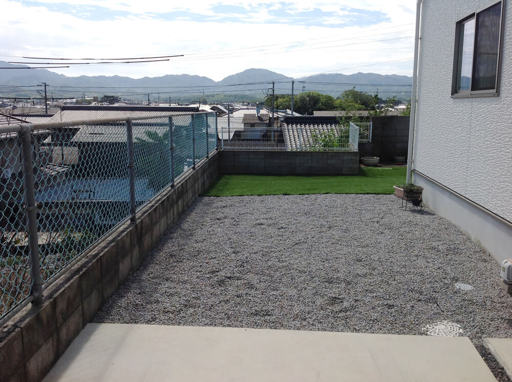 コストの順番でいくと、砂利→コンクリート→人工芝となり、土の状態をなくす方法としては砂利が一番コストを抑えられる方法となります。