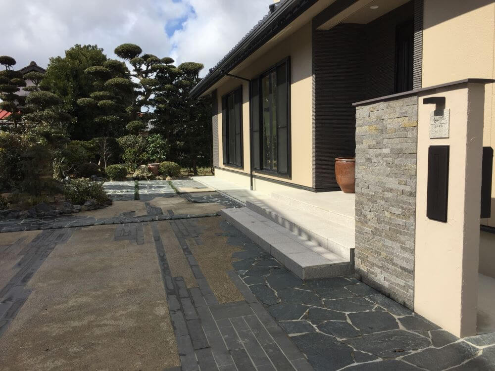 和風住宅に合った洗い出しコンクリートと黒の天然石が主役となる庭園を引き立てています。